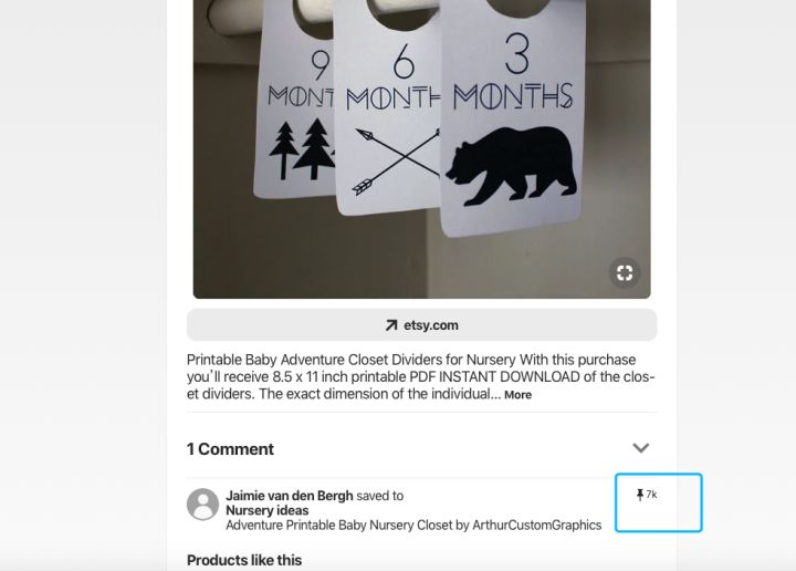 我们发现这个产品体积也不大,重量也很轻,这个本身在Etsy(Etsy是美国一个在线销售手工工艺品的网站)上面有卖的,就是根据宝宝的年龄分类衣服这么个东西,我们直接点击看看 这个产品有多少个人收藏和点赞。