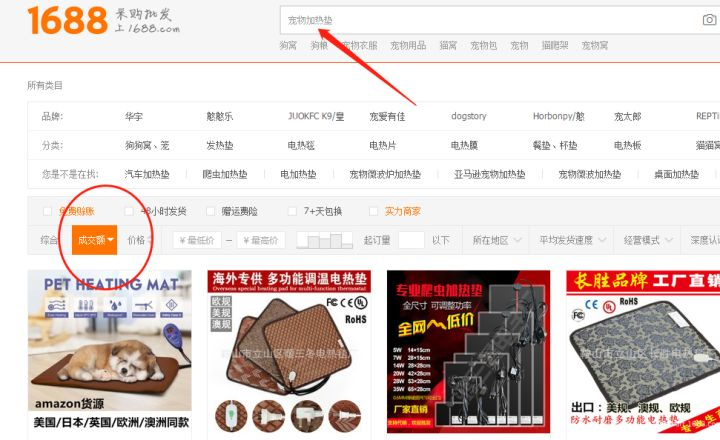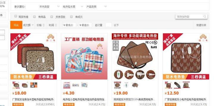 1688搜索关键词宠物加热垫,按照销量从高到低的顺顺序,注意观察厂家地址,选择偏冷地区,因为那些地方会比较专业,价格也比较优惠。然后进入其中一个店铺再次输入宠物加热垫,就可以看到店铺内的全部款式(只需要分析3-4个大卖店铺就可以了,因为他们的货已经很全面了)