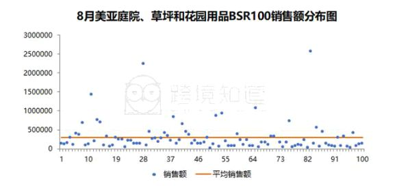 2018 年 8 月美亚庭院、草坪和花园用品(Patio,lawn&garden)Top100产品总销售额为 29166280 美金,日销售额约为 972209 美金,整体平均销售额为 294609 美金。