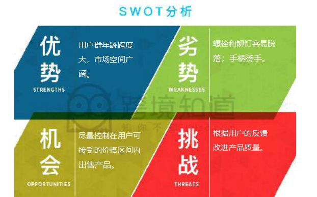 我们对这几款产品做了 SWOT 分析,其中优势和劣势是内在于产品本身、就跨境而言的优缺点,机会和挑战是外在于产品、目标市场现存的商机和威胁。