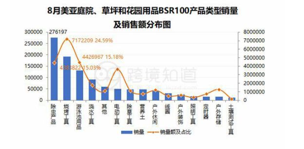 从 2018 年 8 月美亚庭院、草坪和花园用品(Patio,lawn&garden)热销品类 Top100 产品销售量分布情况来看,销量前三名的产品类型为除虫产品、烧烤工具以及游泳池用品。
