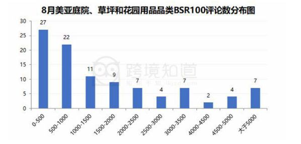 2018 年 8 月美亚庭院、草坪和花园用品(Patio,lawn&garden)共有 27 个产品的评论数集中在 0-500 条之间,说明这些产品的市场可进入空间不算很大。有 33 个产品的评论数在 500-1500 之间,说明这些产品正在稳定地占据市场。评论总数排名第一的产品是一款除虫产品,有 8527 条评论。