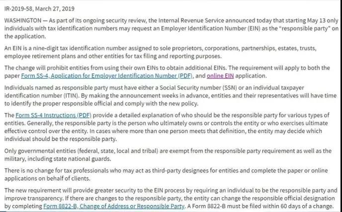 从2019年5月13日起,必须有SSN (美国公民的社安号)或ITIN (非美国公民的美国个人税号)才能申请美国联邦税号EIN!