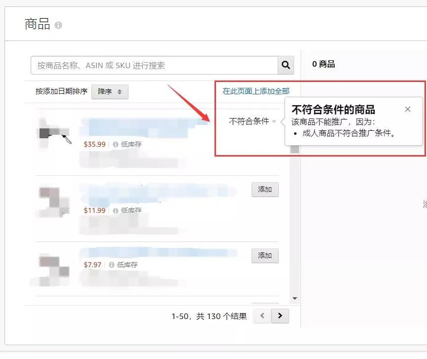 第四步,将页面拉到选择商品的区域,这个时候如果看到某款产品显示【不符合条件】,将鼠标移上去就会看到提示。如果提示是“成人商品不符合推广条件”,那么说明该产品已经被标记了。备注:由于其他卖家修改你的类目或者亚马逊系统标记你的产品都不会有邮件或信息通知你,卖家朋友要经常去查看一下自己的产品是否正常,特别是那些产品本身就容易被标记的卖家,每天去检查一次都不为过。