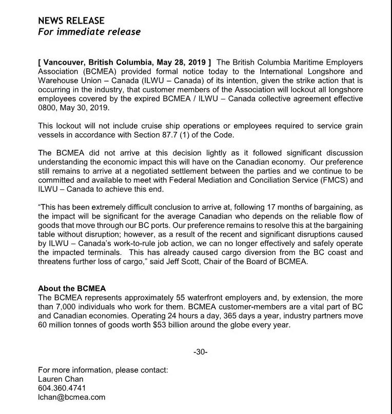 哥伦比亚海事雇主协会(BCMEA)向加拿大国际沿岸和仓库联盟(ILWU–Canada)发出正式通知,表明其意图,鉴于该行业正在发生罢工行动,协会的客户成员将锁定所有过期的BCMEA/ILWU–加拿大集体协议所涵盖的沿岸员工,于2019年5月30日上午8点生效。