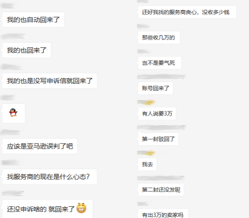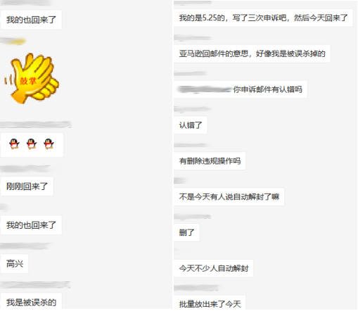 今天下午,距离525封号事件已经过去4天了,卖家群终于传来好消息,多位卖家表示自己的账号已经解封,以下为消息截图: