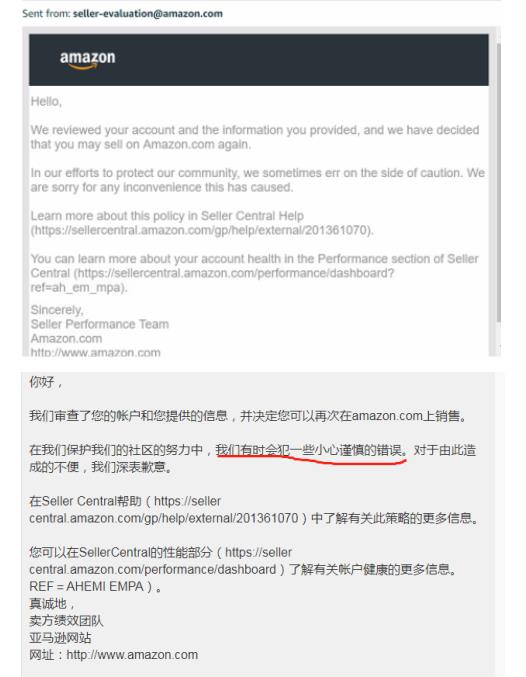 亚马逊在邮件中声明:在我们保护我们的社区的努力中,我们有时会犯一些小心谨慎的错误。对于由此造成的不便,我们深表歉意。