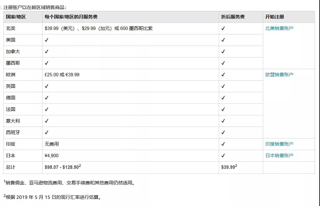 为了帮助您拓展国际业务,我们目前为您提供 $39.99 的月服务费优惠价格(根据 2019 年 5 月 15 日的现行汇率进行估算)。通过支付这笔月服务费,您将可以在10 个国家/地区销售商品。即刻注册在北美、欧洲、日本和印度开店,我们会将您所有账户的月服务费总额减至 $39.99,即每月优惠多达 $89.00(销售佣金、亚马逊物流费用、交易手续费和其他费用仍然适用。)。