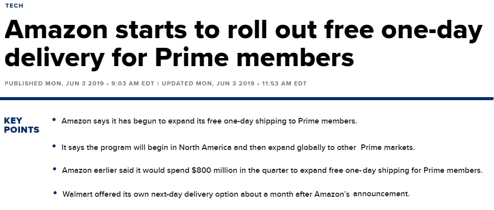 当然,今年的Prime day还有另外一个必须要参加的理由,因为上半年亚马逊为了扩大Prime会员人数,投入了8亿美金将配送服务升级至一日达。