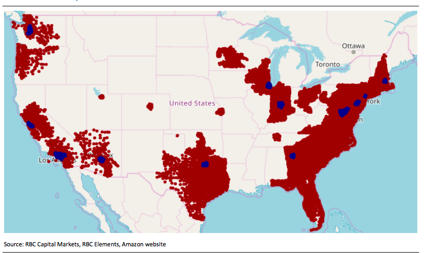 RBC的报告显示从14年到18年,亚马逊在不断扩大自己次日达配送的范围,同时亚马逊的销售也是水涨船高。