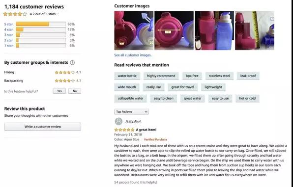 亚马逊意识到评价的力量,并且忠实于他们的“买家第一”的心态——让评价成为每个产品页面的主要部分。买家可以查看其他顾客的图片,根据关键词过滤评论,在评论中搜索内容,根据产品星级对评论进行排序,并查看其他的问题和答案。