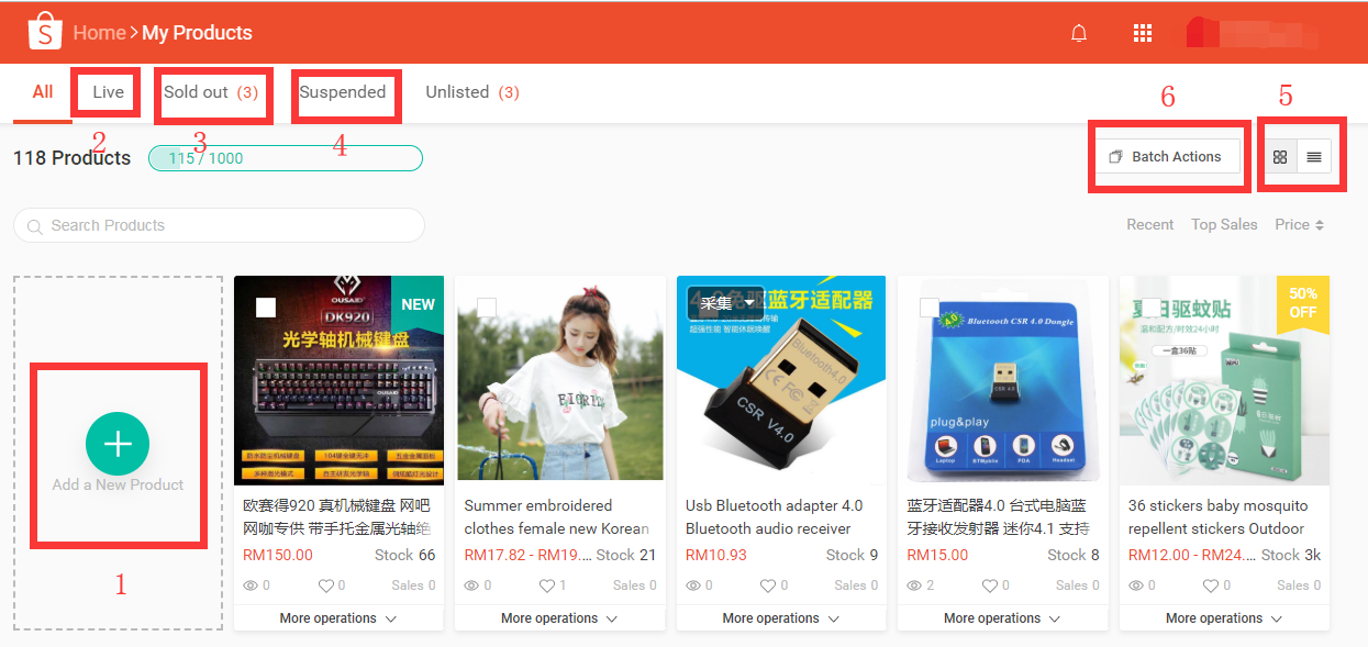 -点击6,【Batch Actions】,卖家可以进行上传新商品或编辑现有商品的操作。