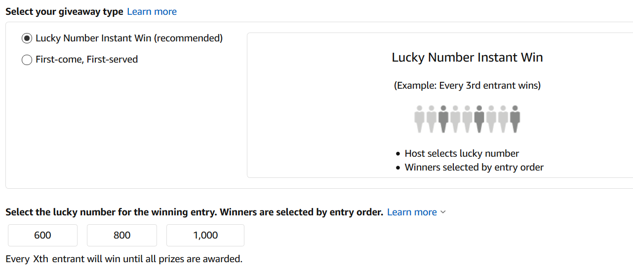 a、Lucky Number instant win,就是幸运数字中奖方式, 每隔多少个参与者可以中奖,例如lucky number是600,那每600个人就会中奖,直到奖品分发完毕。