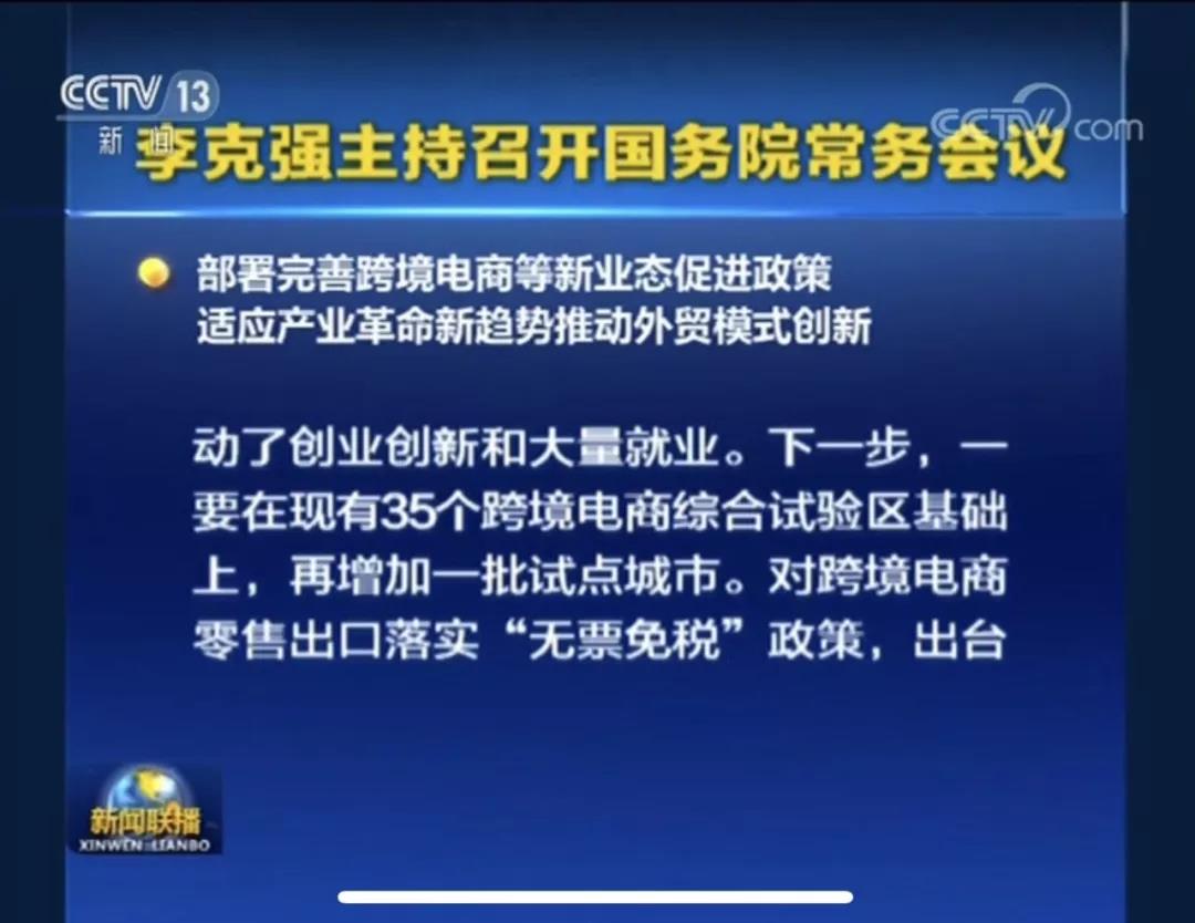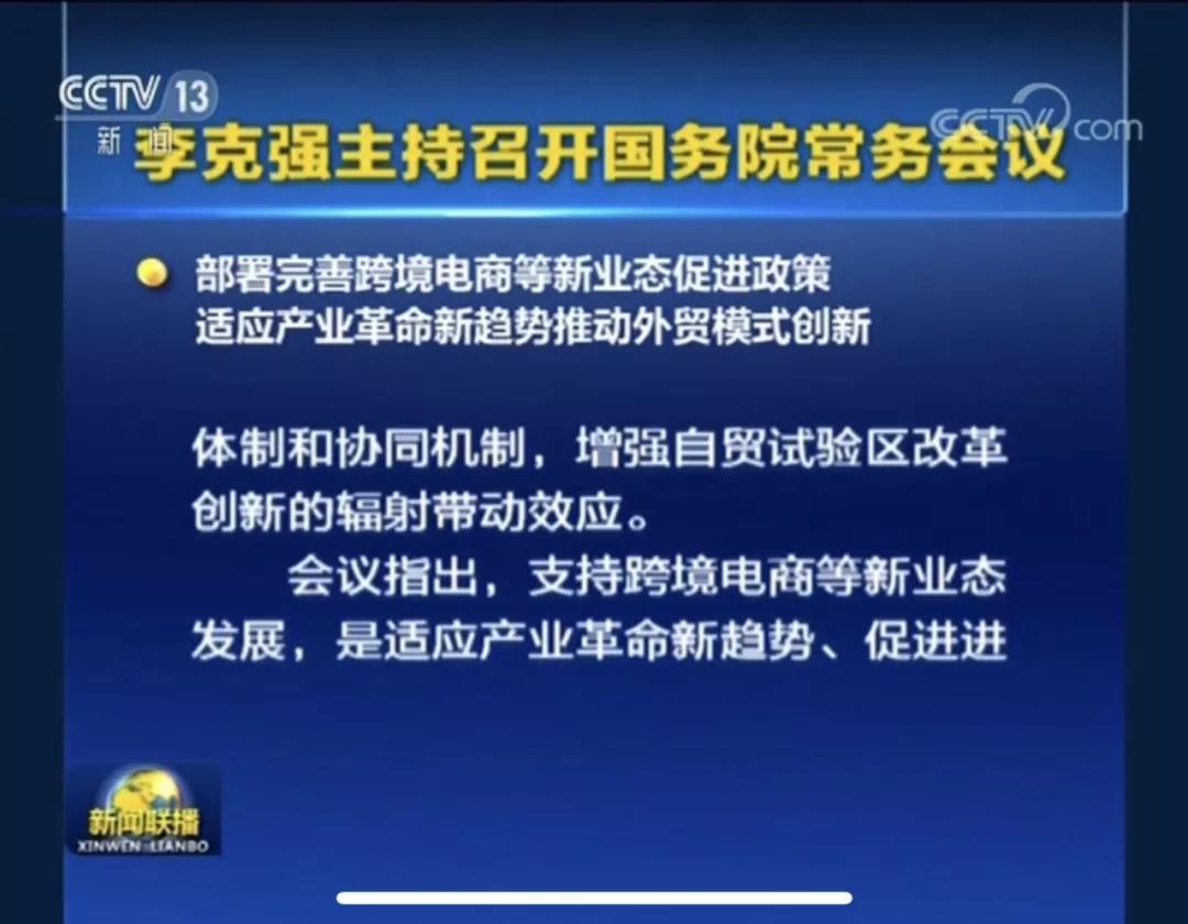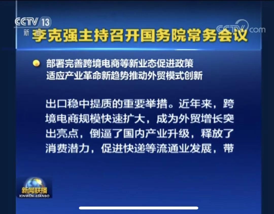 会议指出,支持跨境电商等新业态发展,是适应产业革命新趋势、促进进出口稳中提质的重要举措。近年来,跨境电商规模快速扩大,成为外贸增长突出亮点,倒逼了国内产业升级,释放了市场消费潜力,促进快递等流通业发展,带动了创业创新和大量就业。