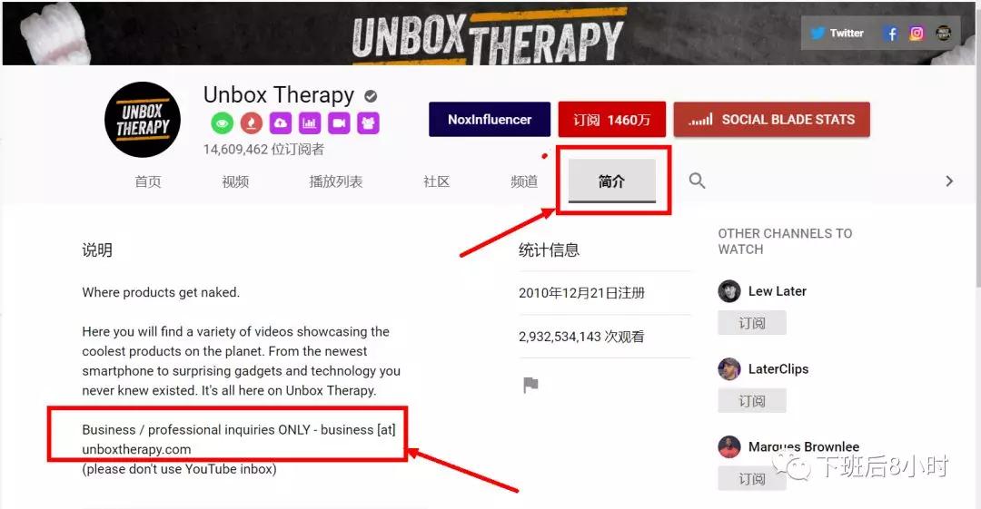 搜索过后,会出来很多做smartphone review的KOL,我们以第一个Unbox Therapy为例,大家都知道UT是3C界的红人,点击他的频道"简介"的按钮。