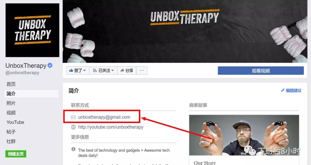 简介这里主要可以让你更好了解这个红人的测评范围,在这里可以看到Unbox Therapy的邮箱,这样我们就可以给他发邮件。 如果在这里看不到Youtube的邮件,我们可以去看看他的其他社交媒体,比如Facebook主页、Instagram、twitter、Google Plus等,都去看一看是否在其他社交媒体留下了邮箱或者联系方式。我们一定要学会综合运用的思维,在这个频道上找不到联系方式,可以多去他其他的社交媒体上看一看,以下就是这个红人在Facebook主页留下的联系方式。