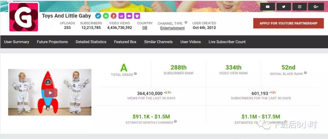 也可以在Socialblade搜索框直接输入红人Youtube channel的名字,来看看这个KOL打得等级以及最近的趋势变化,这个可以作为很有价值的参考依据,防止被KOL欺骗数据,毕竟现在国外粉丝数、观看量、互动量等都是可以刷的。