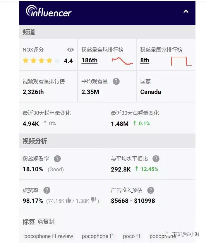 筛选好条件之后,对那个KOL比较感兴趣可以点击他的频道看具体的分析数据,觉得适合就到Youtube频道搜索框去找这个红人的联系方式。也可以跟Socialblade一样在谷歌网上应用商店下载Noxinfluencer插件,更方便查看红人的数据分析情况以及受众情况,如下所示: