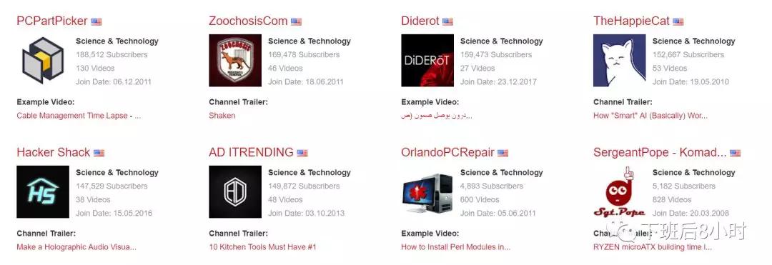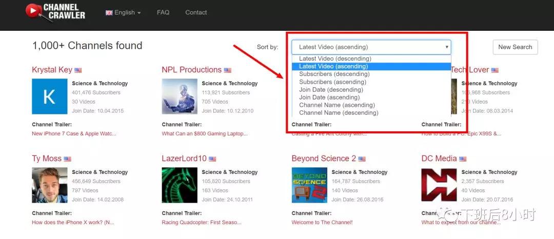 我们类目选择科技,国家为美国,然后点击搜索,就会出现以下1000+的红人频道,可以按照如下红色方框的选项进行排序,这样就非常很快可以查找很多红人资源。