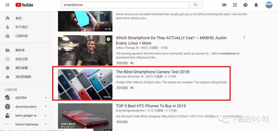 还是以Smartphone产品为例,在youtube搜索框内输入“Smartphone”,找出比较感兴趣的红人,比如以下图红色方框Marques Brownlee频道为例,我们点击进去到"简介"那一栏。
