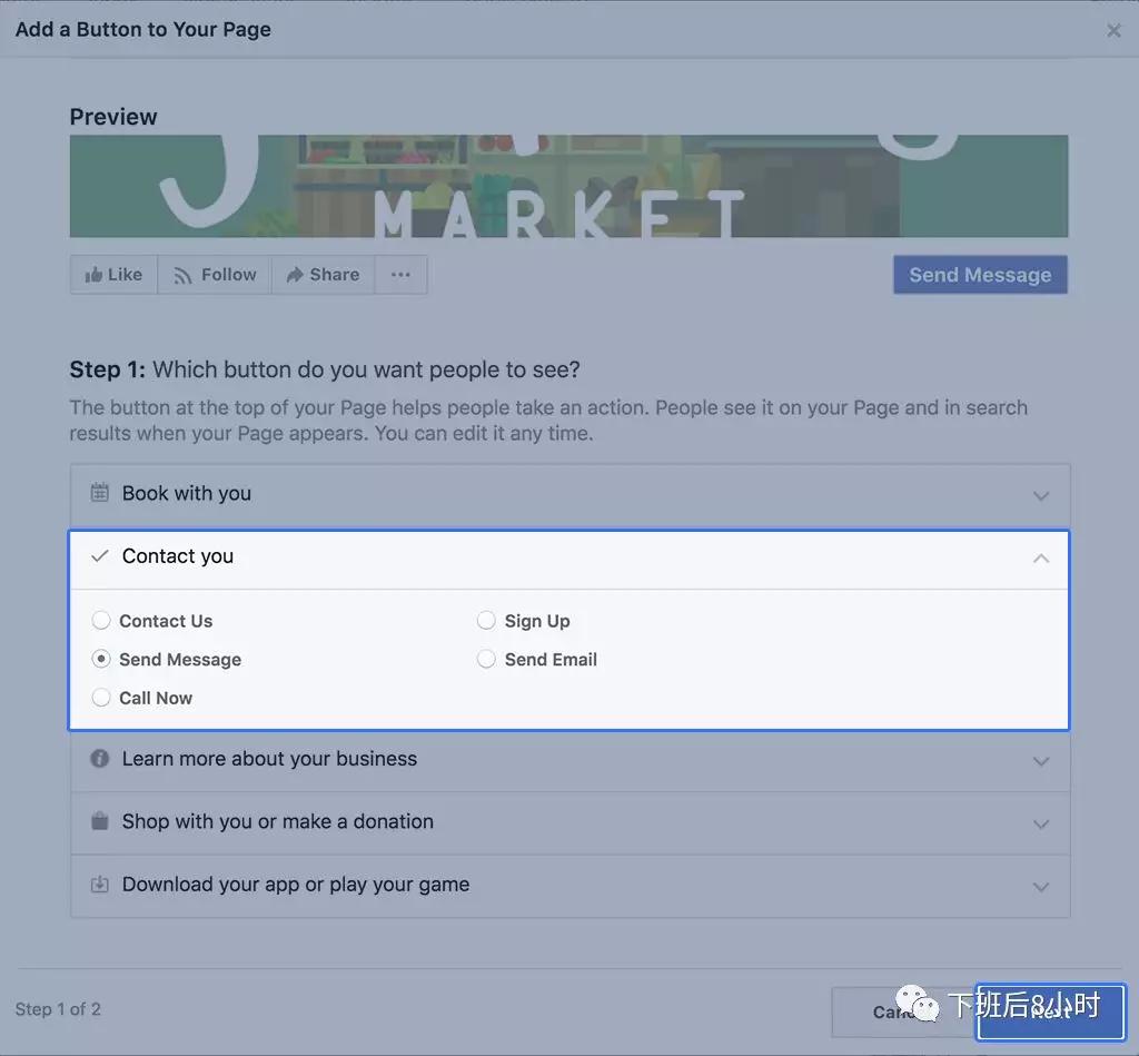 从提供的选项中选择一个按钮并按照要求填写相关信息。在此示例中,我们选择和你联系类别,并选择发消息作为行动号召。