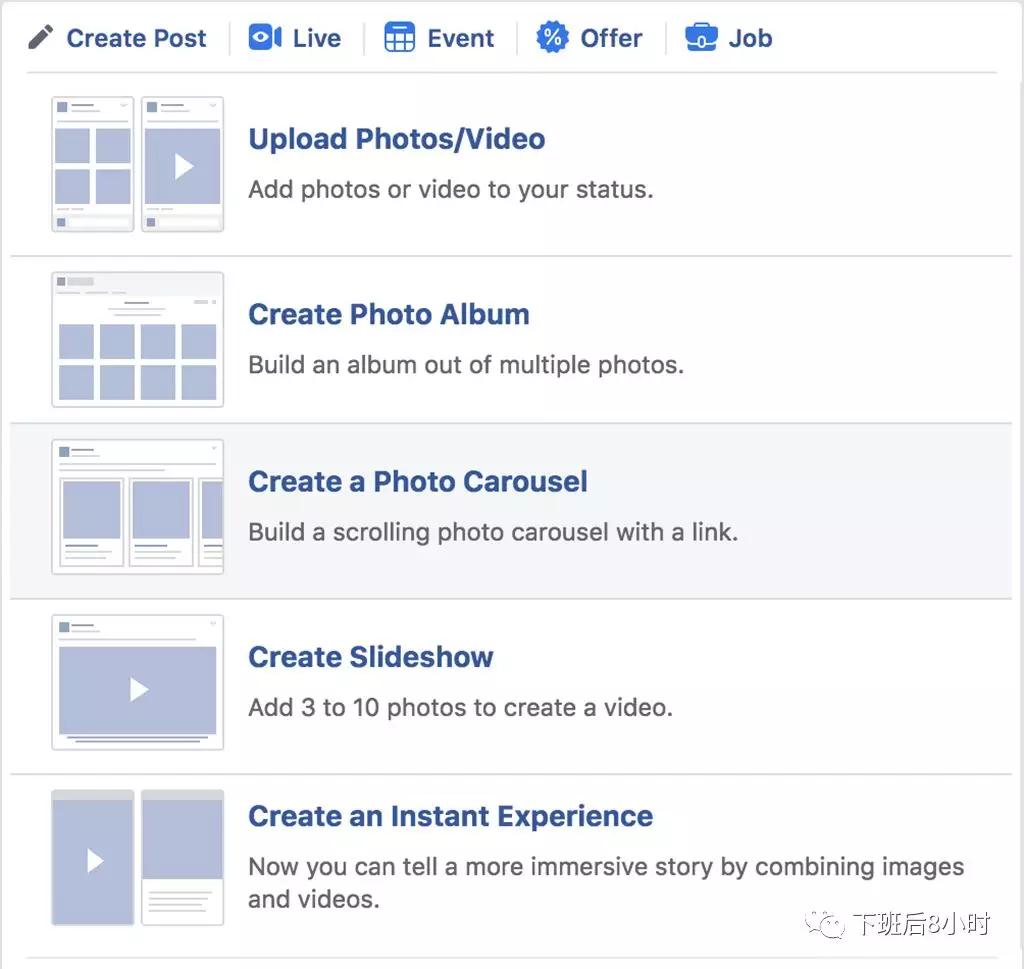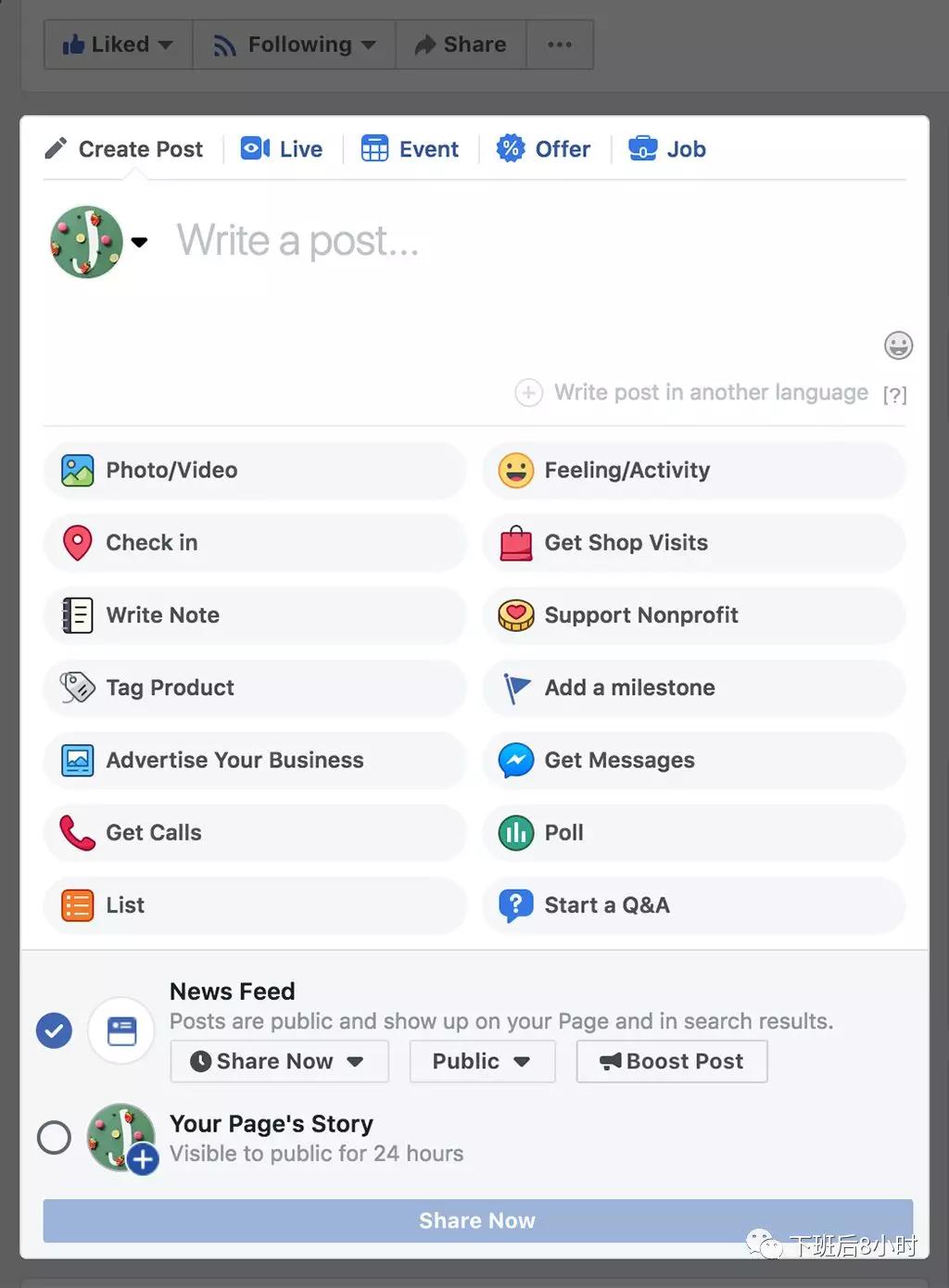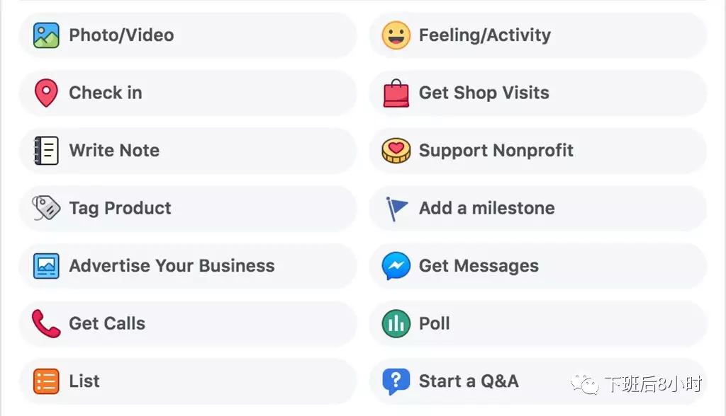 当您准备创建主页帖子时,您会发现可供选择的帖子类型有很多种,例如照片/视频、感受/活动、优惠、活动以及发布广告等等。