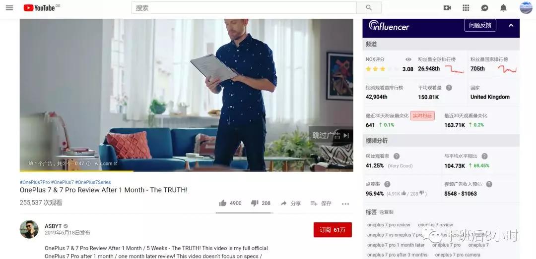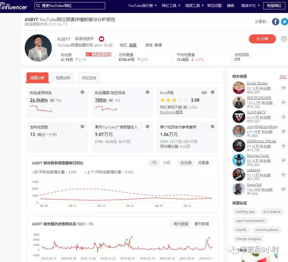 第二,Socialblade跟Noxinfluencer插件,可以帮助你很好的分析红人视频排名,观看量,互动率等情况