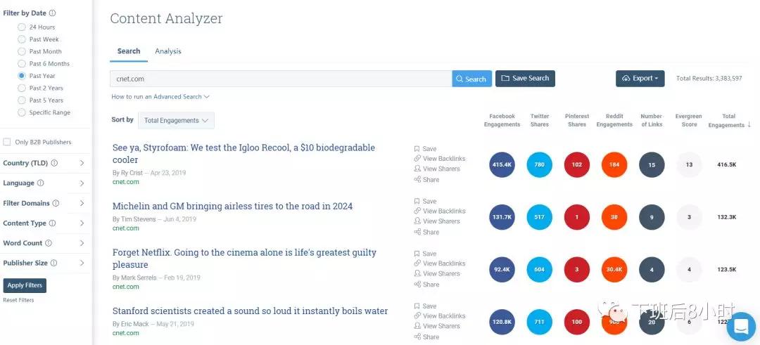 也可以直接进去buzzsumo官网,比如你想看某个科技媒体的哪些文章转发量最多以及你想跟这位文章的编辑合作,可以直接输入你要查的媒体域名,以cnet为例。