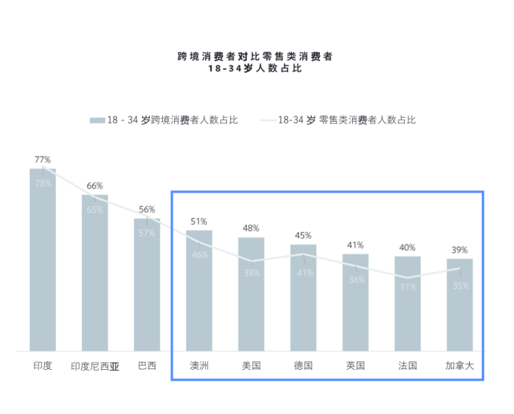 在发达市场中,跨境消费者比整体零售类消费者更年轻。虽然新兴市场中的跨境消费者也较年轻,但就同年龄段人数占比而言,跨境消费者与零售类消费者相比并没有明显的差异。