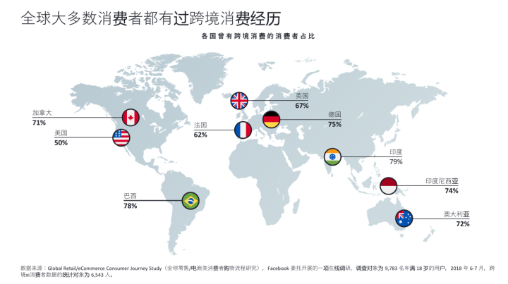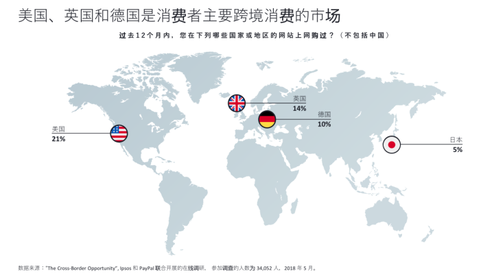 同时,根据调查的数据显示:美国、英国和德国是主要的跨境消费市场。