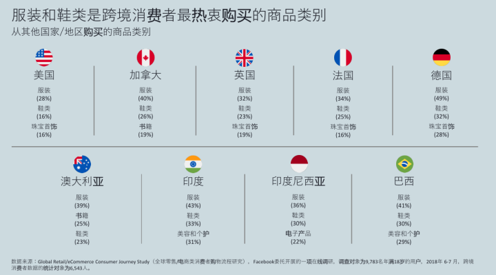 各个国家/地区的购物偏好有所不同,在调研了6500+人之后,我们获得了这些数据:总体而言,服装和鞋类是国外消费者最为热衷的商品类目。