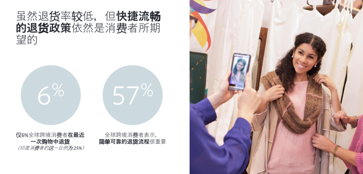因为退货的话,消费者需要自行支付相应的邮费,因此,相较于国内,跨境电商的退货率较低。有57%的消费者表示简单可靠的退货流程很重要。