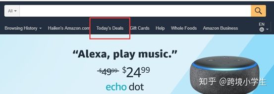 首先打开亚马逊前台页面,找到Today’s Deals的选项进入: