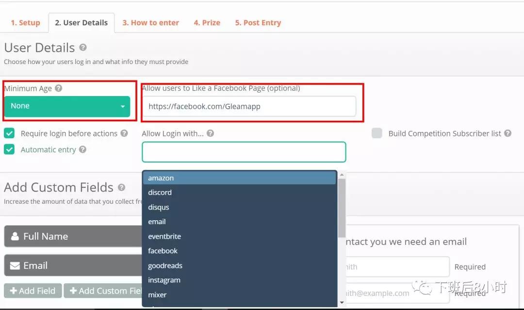 第二步就是User Details,可以设置参与者的年龄,以及是否让用户关注Facebook主页(optional),也可以勾选用户通过facebook, instagram,amazon等先Login,活动开始之前,这个要看自己考虑要不要添加,除非赠品非常非常受用户欢迎,否则这一步会过滤掉很大一部分人。