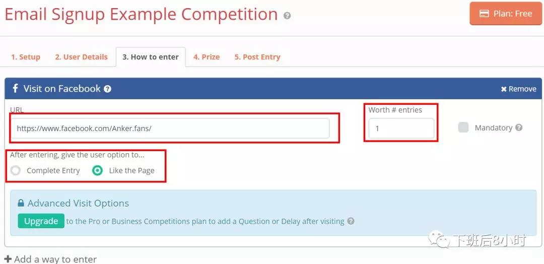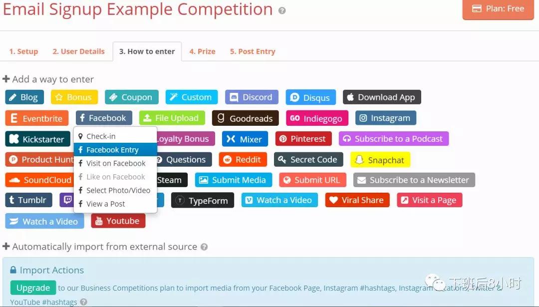 第三步就是如何进入,你可以设置一些规则,比如关注Facebook page, instagram page等。