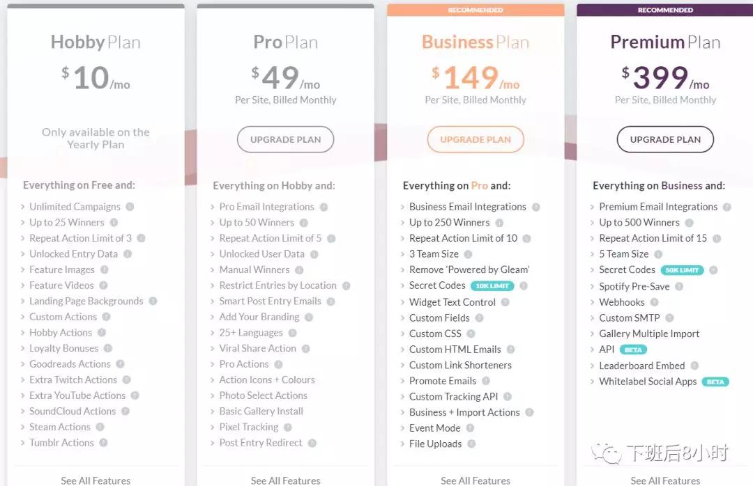 下图是免费版以及付费版的区别,如果刚刚开始做giveaway,可以尝试下免费的试下效果,测试完之后才考虑下付费版的获取更多权益。