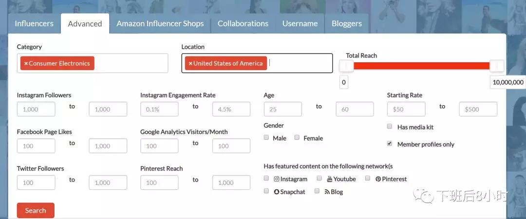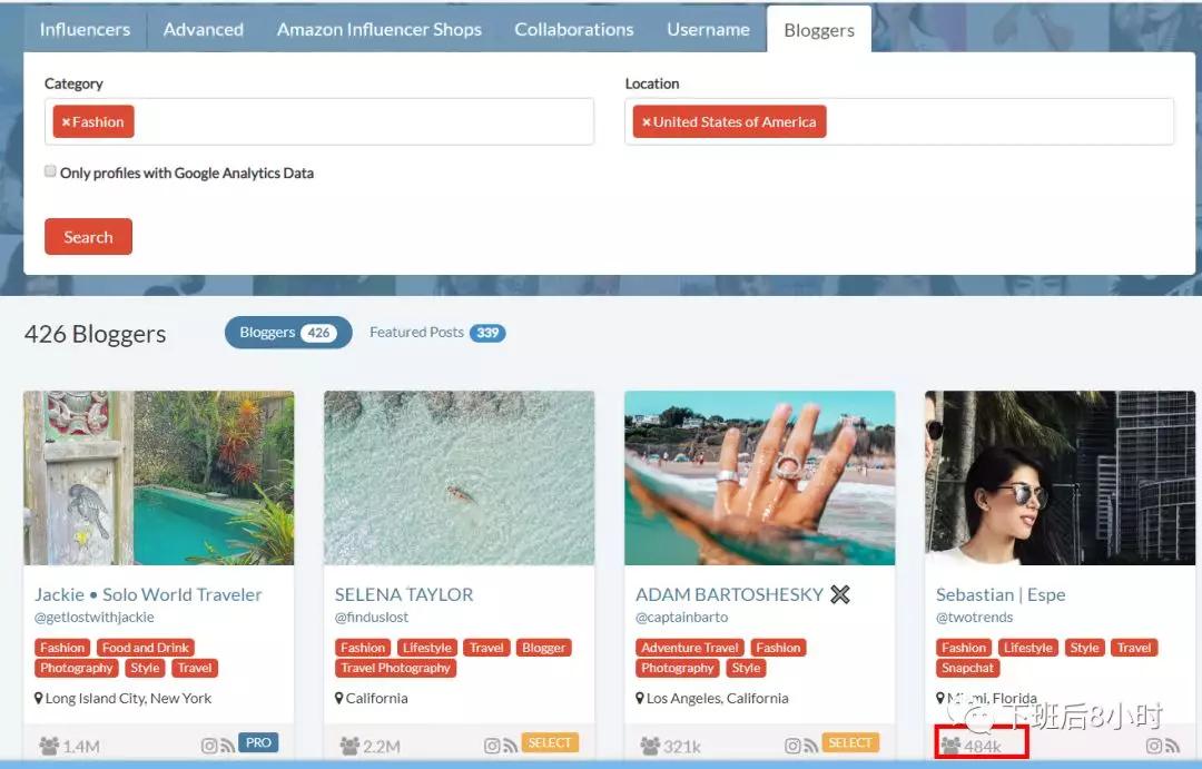 Category,Location,Engagement Rate,Followers等是非常几个关键的信息点。另外需要指出的是筛选条件里面有个Google Analytics Visitors/Month,也就是根据有的红人会有自己的博客,谷歌GA可以获取到月访问量的数据。