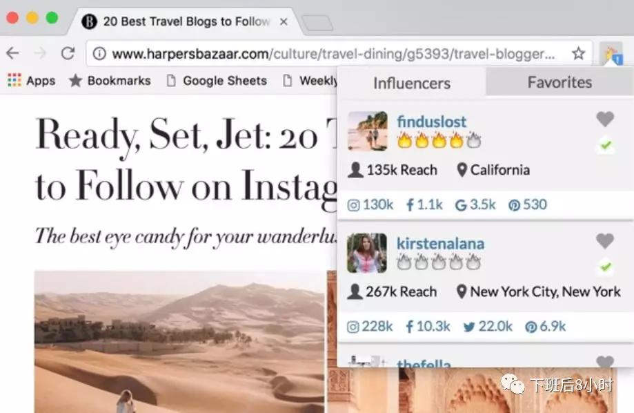 也可以安装下这个网站的谷歌插件Influencer Engage, 只要红人的Instagram或Twitter帐户出现在网页上,插件的图标就会发生变化,通知您在influence.co数据库中存在匹配项。