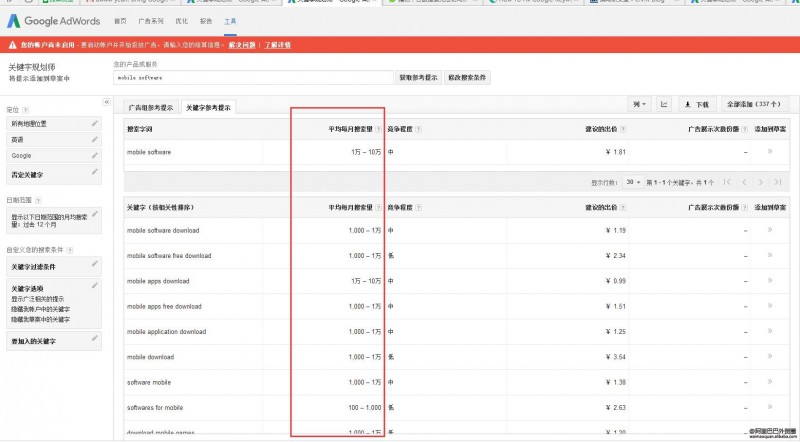 需要注意的是,谷歌现在能搜索出的关键词搜索量,只对Google Adwords付费用户显示具体搜索量,非付费用户显示的只是大概的搜索范围。