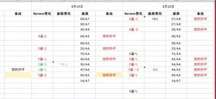 上图很清晰的记录了8月19日、8月20日这两天店铺评价的变化,可以看到这两天的记录中被亚马逊删除的都是5星好评,掉评数量是在某一天中变化是细微的,集中在一个两个最多三个的掉。