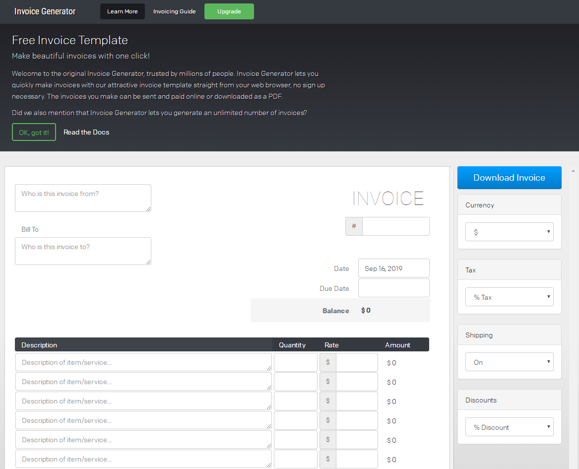 (1)优点:这个网站完全免费使用,允许生成无限数量的invoice。可以在web页面生成的模板中将所有细节添加到发票中,并将发票通过电子邮件发送给客户,当然也支持下载PDF。
