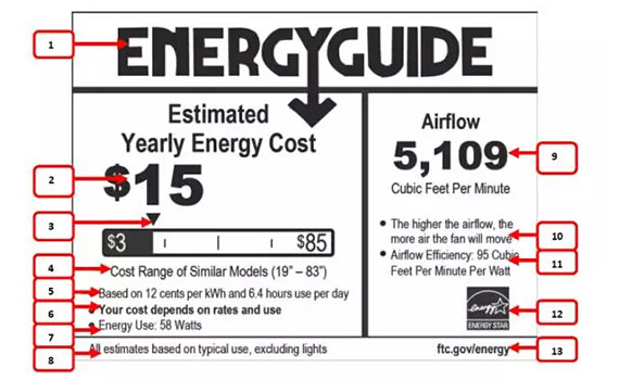 3. 年用电成本显示位置:成比例的显示在最低和最高预计年用电成本之间。对于吊扇尺寸<19” 预计年用电成本为$10~$50,对于19”≤ 吊扇尺寸<84”预计年用电成为$3~$34。