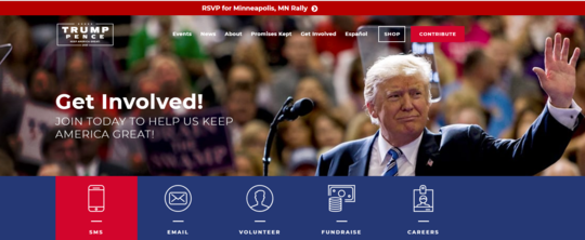 此外,在特朗普的主页上还设有“让美国再次伟大”的捐款渠道与“美国制造”的购物通道,旨在将自己的竞选金额推向新高。据此前报道,在第三季度,特朗普与共和党全国委员会共募集1.25亿美元资金,主要由6位数的捐款组成,单单在汉普顿举行的集会上就募资达到1200万美元。