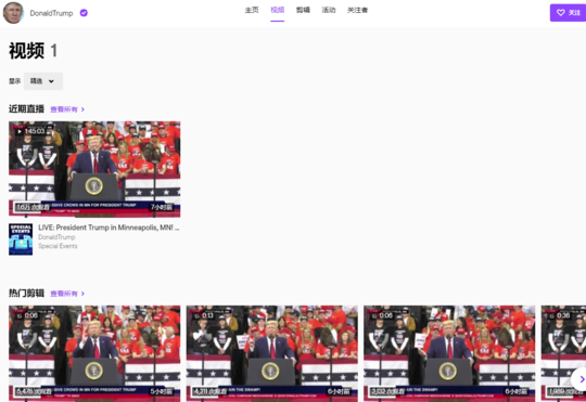 不到一天时间,特朗普的Twitch账号已经收获超过1万名粉丝。与之相比,特朗普的Twitter账号有6500万粉丝。