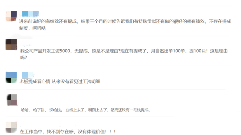 入职前谈好的绩效提成,入职后老板选择性失忆(这位老板怕不是属鱼的?),还有做出业绩却拿不到相应的提成的,甚至拿多少提成全都取决于老板心情的,(OK你是老板你可以任性,我拿你没办法辞职总可以吧),还有最后那位兄dei一腔抱负无处体现,怒发三个感叹号也是很气愤了(摊手)。