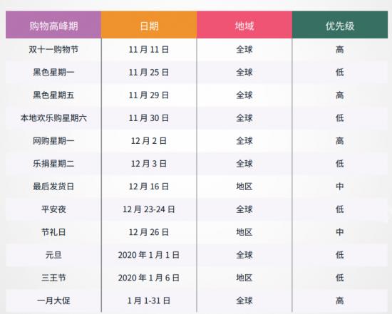 作为卖家,我们应该牢记重大节假日时间,并在此日历上标注节日季营销活动及启动日期。小编提醒您11、12月份节假日较多,作为卖家一定要提前准备!