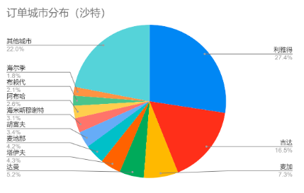 订单的区域分布和城市人口数量及发达程度成正比。沙特购买力排在前三位的城市分别是利雅得、吉达和麦加,阿联酋是迪拜、阿布扎比和沙迦。