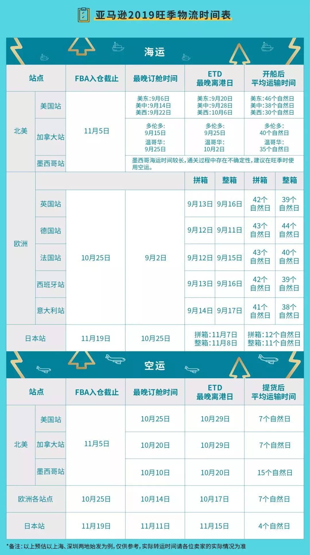 亚马逊早在9月份即公布了2019年全球各站点物流时间表,针对各站点的FBA仓库入库截止时间、最晚订舱时间、平均运输时间等都做了详细的说明,卖家可以按照表里的时间线进行秒杀产品的备货准备。