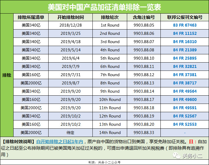 3、2019年9月17日,美国贸易代表办公室发布3份关税排除清单公告通知,分别涉及美国340亿关税排除、160亿关税排除和2000亿关税排除。本次2000亿关税排除清单共涉及38项产品。(注:此为2000亿关税第二批排除清单)