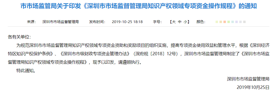 但现在有好消息,暂停了五个月的深圳补贴政策又重新开始了!10月25日,深圳市市场监督管理局发布了关于《深圳市市场监督管理局知识产权领域专项资金操作规程》的通知。